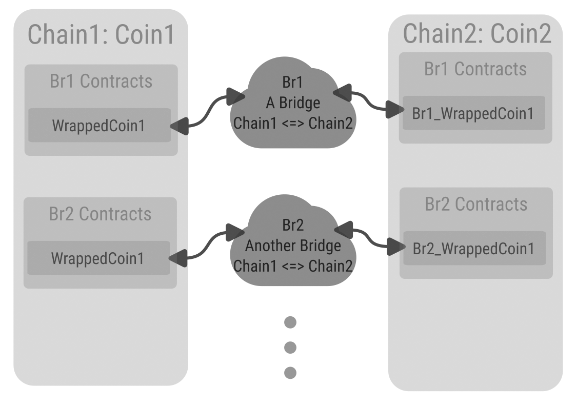 Each bridge exposes a different wrapped version of the native coin they bridge to another chain. Br1_WrappedCoin1 is used by Br1 (a bridge) and Br2_WrappedCoin1 is used by Br2 (another bridge), to represent Coin1 on Chain2.